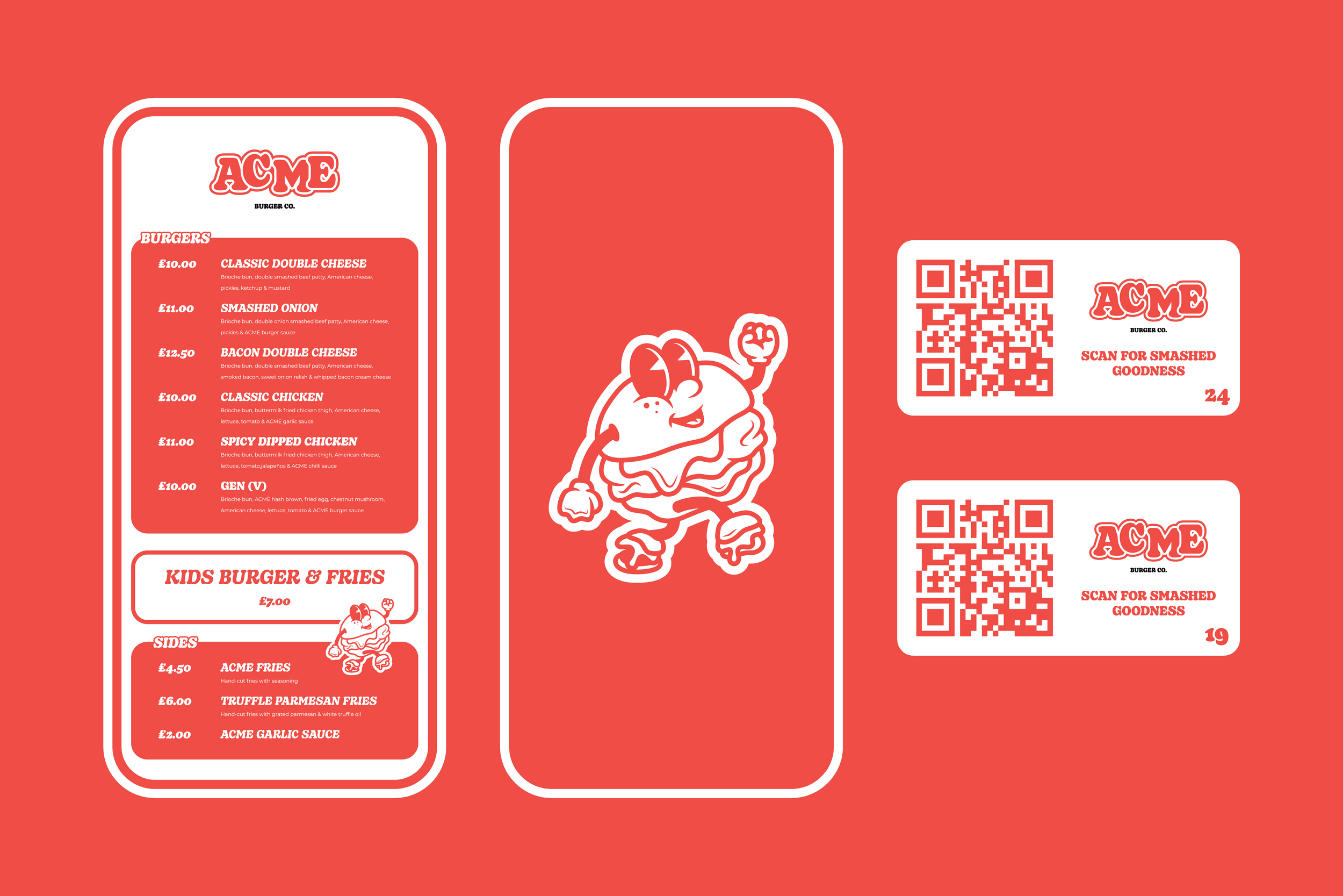 A mascot was created to bring the brand to life, embodying the fun and flavour that ACME Burger Co. offers. The design of 'Smash' was carefully crafted to be both inviting and memorable, appealing to customers of all ages.